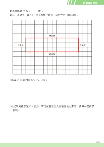 數學學習領域 數學大挑戰 (B 組 ) 姓名: 題目:老師將一條 30 公分長的繩子圍成一個長方形 ( 如下圖 )。 語文學習領域 ( 國語文 ) (1) 請問它的面積是多少平方公分 ? (2) 如果把繩子減掉 4 公分,有可能圍出更大面積的長方形嗎 ? 請舉一個例子 說明。 119